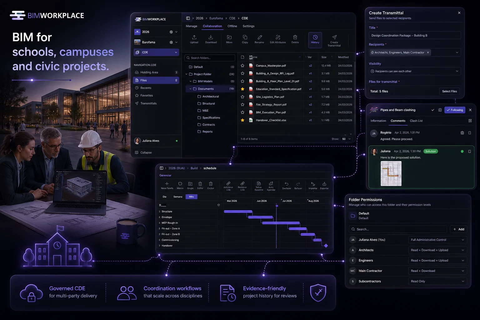 BIMWorkplace gives public-sector delivery teams a governed backbone for multi-party work — from designers to main contractors — so coordination, document control and decision history can be reviewed without rebuilding context from email.