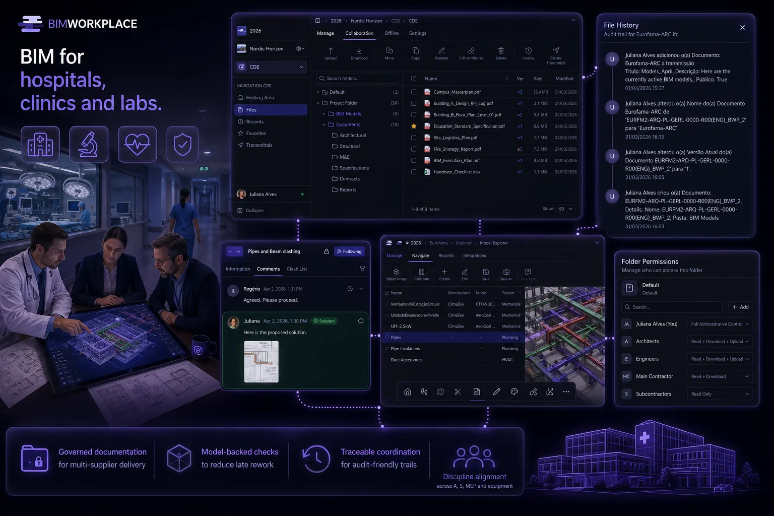 Healthcare projects combine strict room data, MEP complexity, and stakeholder scrutiny. BIMWorkplace helps teams keep multi-supplier delivery under control with governed information, model-backed checks, and traceable coordination.