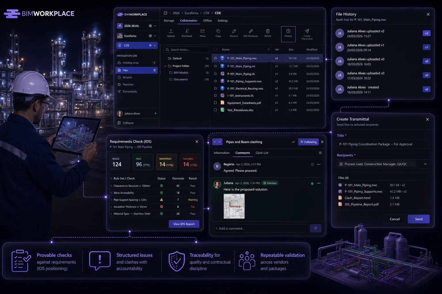 BIMWorkplace lets industrial delivery teams move from subjective sign-offs to provable checks — combining IDS-style validation, structured issues and clashes, and an evidence trail aligned with quality and contractual discipline.