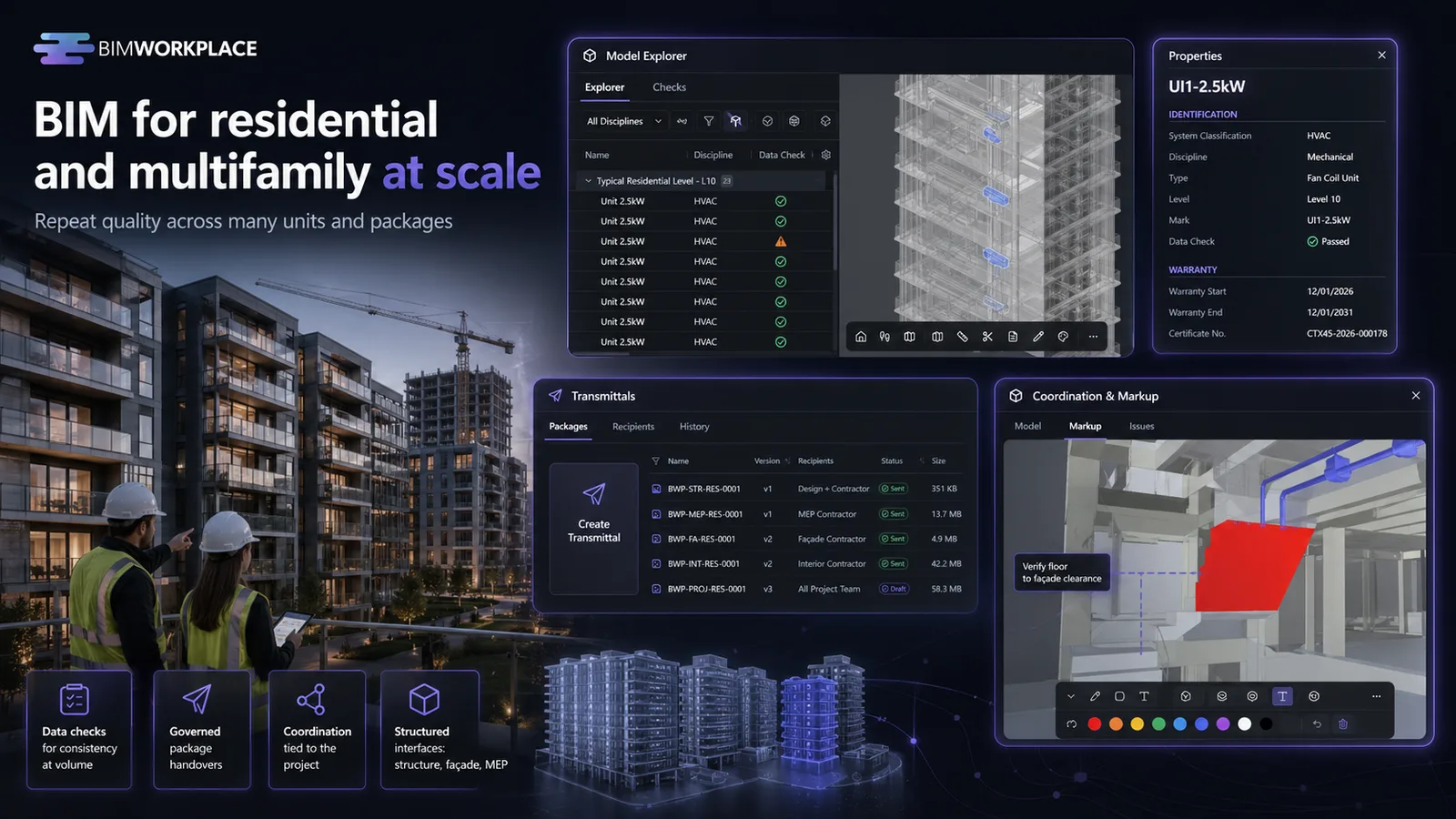 BIMWorkplace helps residential delivery teams keep package handovers governed, coordination tied to the project backbone, and consistency checked across repeating units — turning scale from a liability into a source of efficiency.