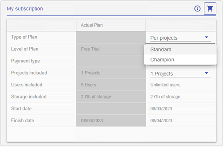 Go to the “Actual Plan” space and in the “My subscription” table, select the desired plan level (Standard or Champion), the type of plan (per project or per users), the payment type (monthly or annual), and the quantity of projects/users according to the chosen plan type.